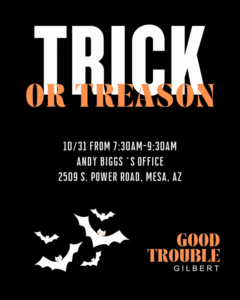 26 Sunday | 27 Monday | 28 Tuesday | 29 Wednesday | 30 Thursday | 31 Friday Time: October 31st at 7:30- 9:30 AM Andy Biggs is running for governor and has been a rubber stamp for the Trump regime’s agenda since day one. Let’s show Biggs and thousands of commuters that we deserve better than an insurrectionist who’s voted to keep the Epstein files locked up and protect the perpetrators instead of the survivors. Costumes are encouraged! (But not required) There will also be a food drive at this event to collect non-perishable items to support our neighbors. We are expecting that there will be delays to SNAP benefits starting next month due to the Republicans keeping the government shut down. We need to step up and be there for our community. No sign-up or RSVP required for this event- just show up and show out!